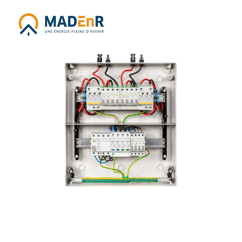 - Coffret combiné AC/DC MADEnR triphasé 9 kWc tout-en-un. Partie DC : 2 MPPT, 1 string/MPPT, inter-sectionneur 1000V/50A, parafoudre DC (In 20kA, Imax 40kA), entrées MC4. Partie AC : disjoncteur C20/6kA, différentiel 40A/300mA Type G haute immunité, parafoudre AC Type II (In 15kA, Imax 50kA). Coffret 2×18 modules IP65 IK09, conforme UTE C15-712-1.