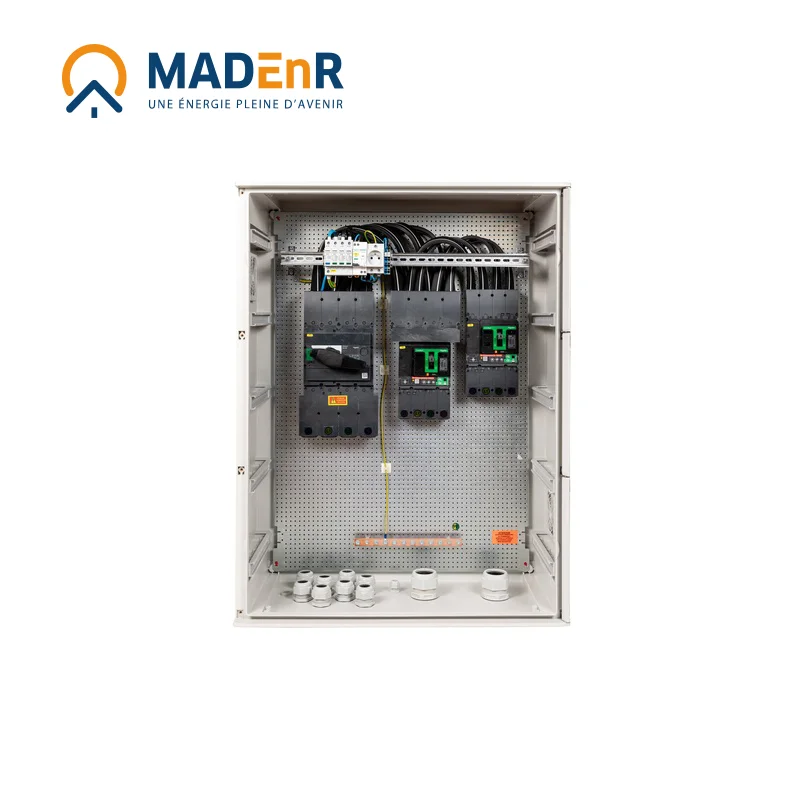 Le coffret AC MADEnR 100kW est une solution de protection professionnelle haute puissance conçue pour sécuriser la sortie courant alternatif des onduleurs photovoltaïques triphasés industriels. Robuste et précâblé, il intègre tous les composants nécessaires pour une installation conforme et sécurisée des grandes installations.